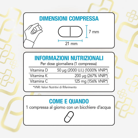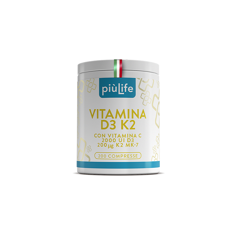 Scegli +LIFE - Vitamina D3 + K2 per proteggere efficacemente le tue ossa e il sistema cardiovascolare. La vitamina D3 può migliorare l’assorbimento del calcio, mentre la vitamina K2 lo indirizza dove serve, mantenendo ossa forti e prevenendo depositi indesiderati nei tessuti molli.